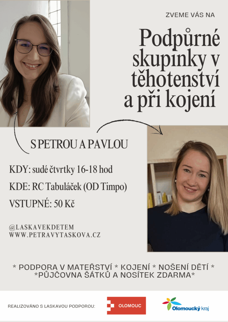 - Podpůrné skupinky v těhotenství a při kojení. Každý sudý čtvrtek v RC Tabuláček (Obchodní dům Timpo) Olomouc. V čase 16-18 hodin. Realizováno s podporou Města Olomouce a Olomouckého kraje.