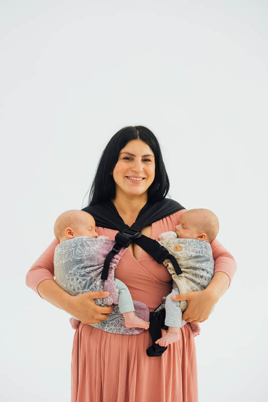 Lennylamb – LennyTwin: Celopřezkové rostoucí nosítko. Materiál: šátkovina. Vhodné: od cca 2 měsíce (minimální velikost zhruba 62, 3.5Kg) do 1,5 až 2 let. Bederní pás: tvrdý, rovný. Možnost rozdělení na 2 samostatná nosítka: ANO (nošení na boku).
